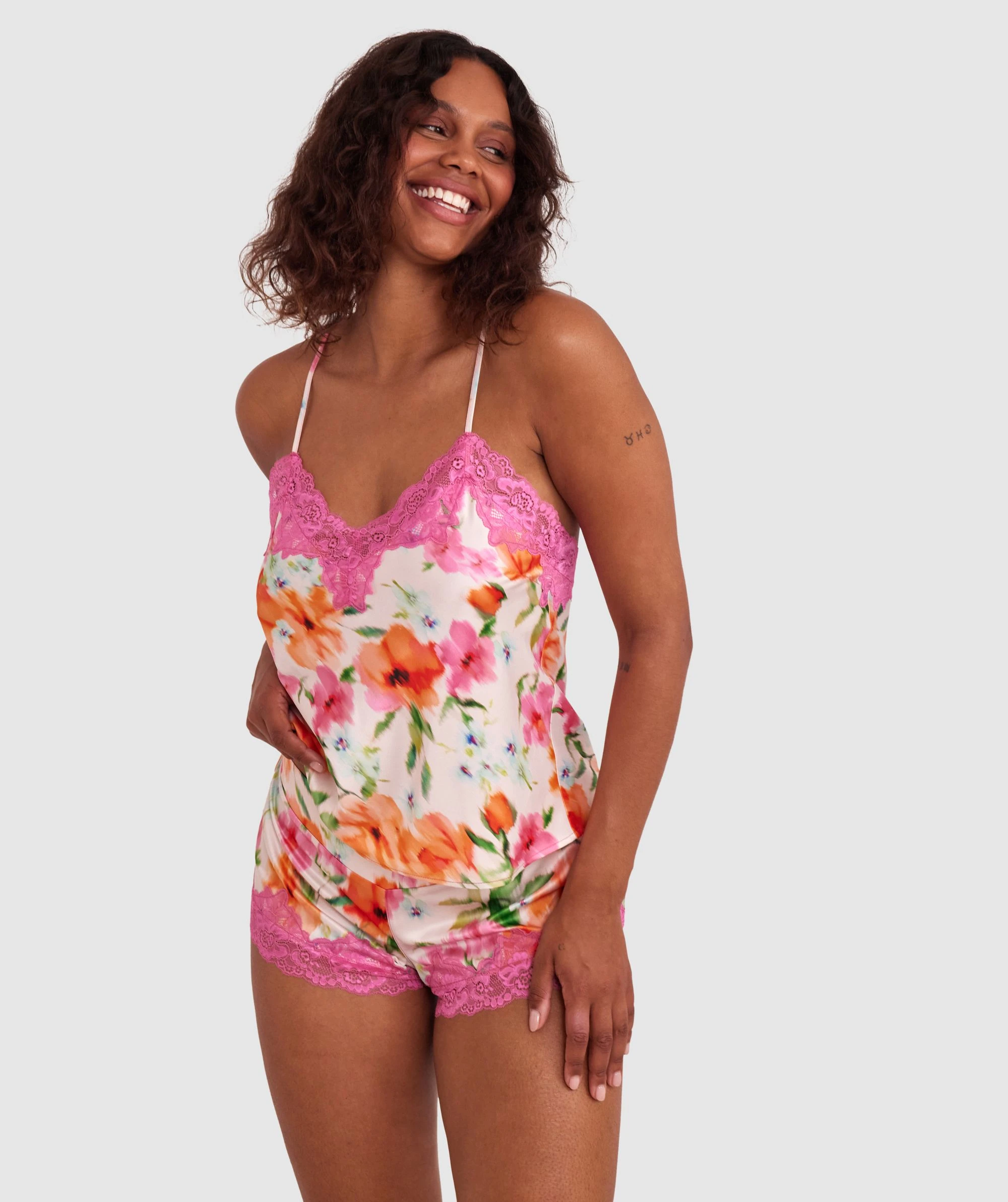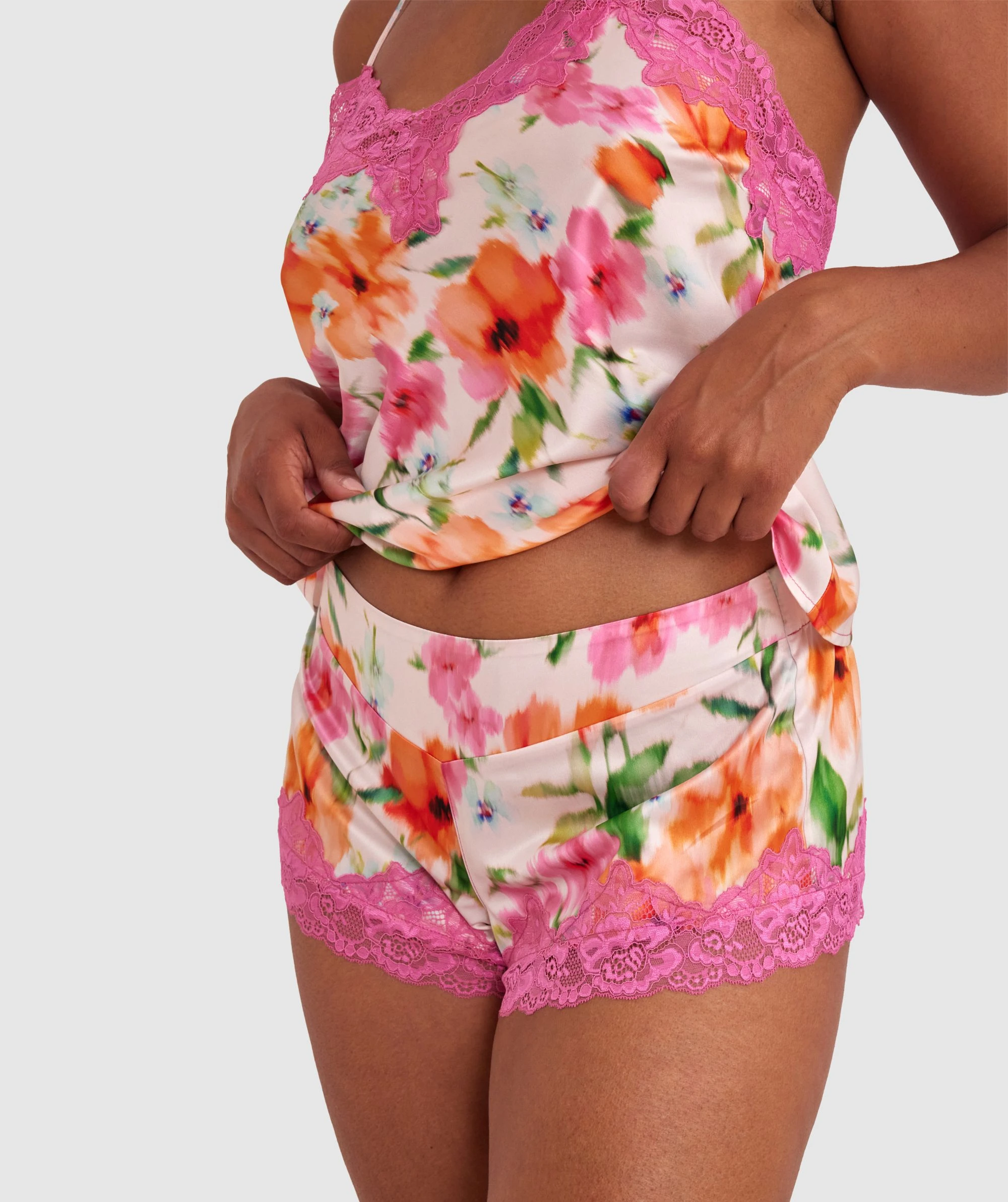 Grab our Eloise Shorts, a delightful pairing of comfort and style. A little garden of relaxation, these are adorned with vibrant orange flowers and a touch of pink lace. Slip in and experience the beauty of leisure like never before.