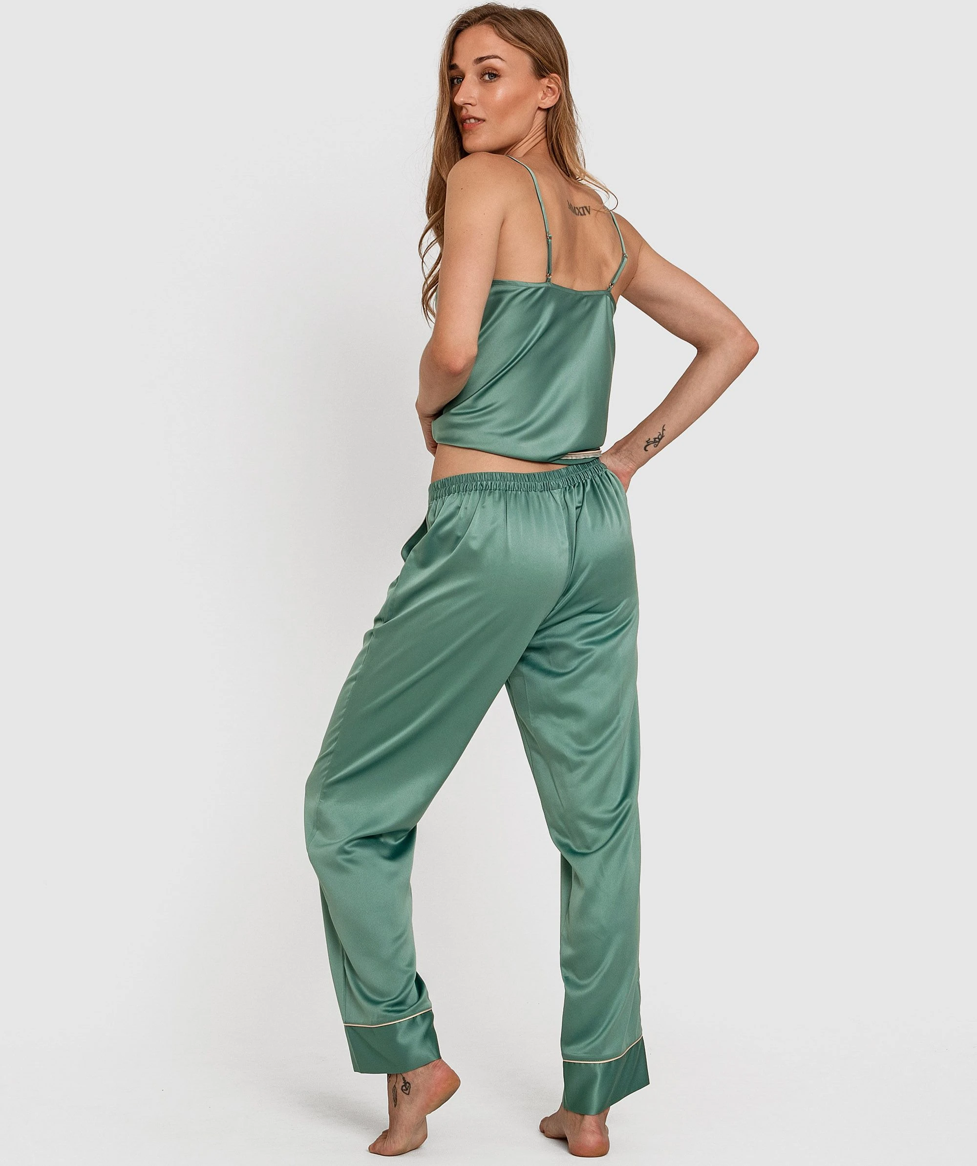 Get cosy with our Liquid Satin Long Pant in pretty green. Made with luxuriously soft and shimmery satin that moulds to the body. Comes with a wider waistband for ultra support. You’ll love tumbling in bed in this stunning piece. Pair with our cami.