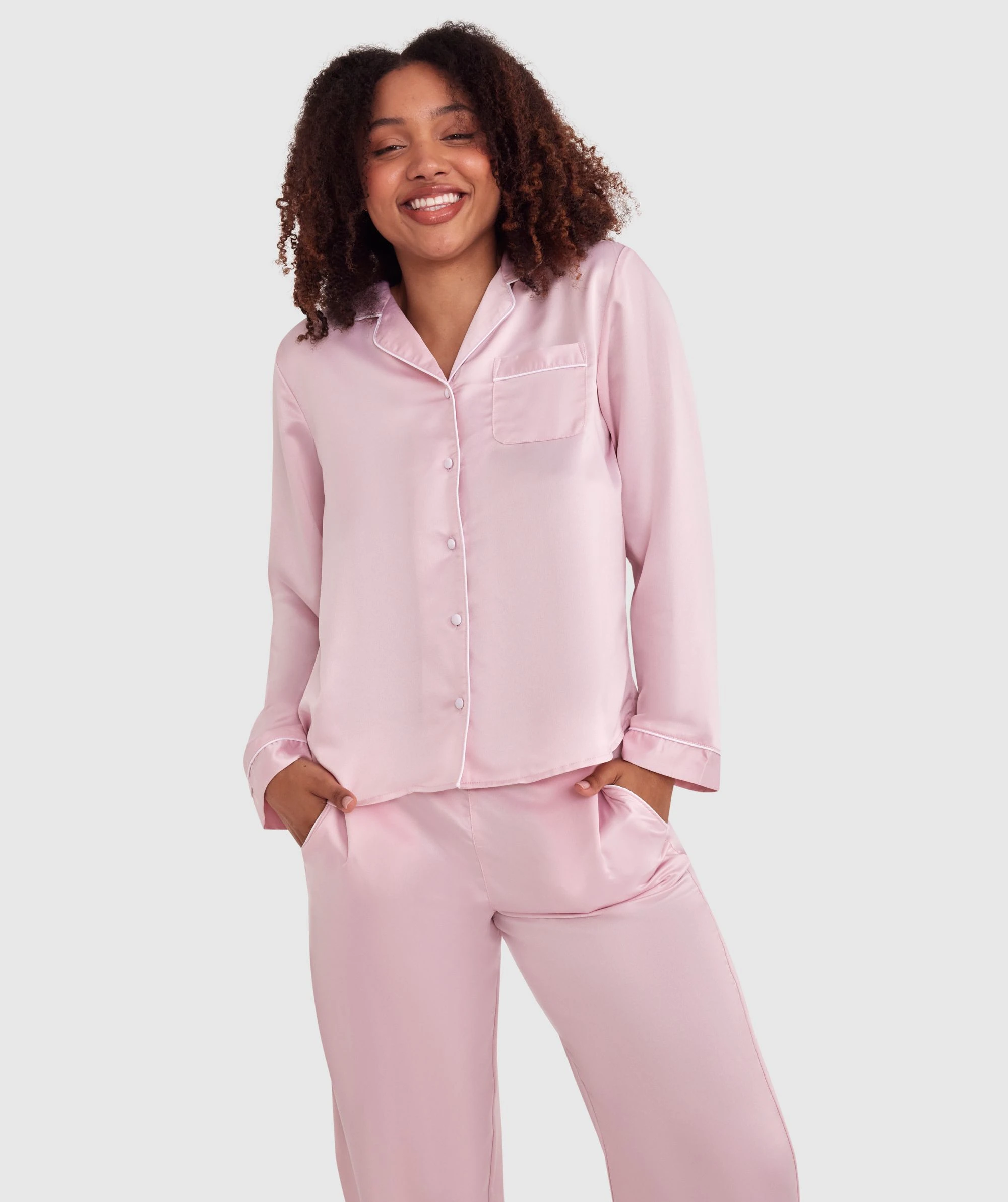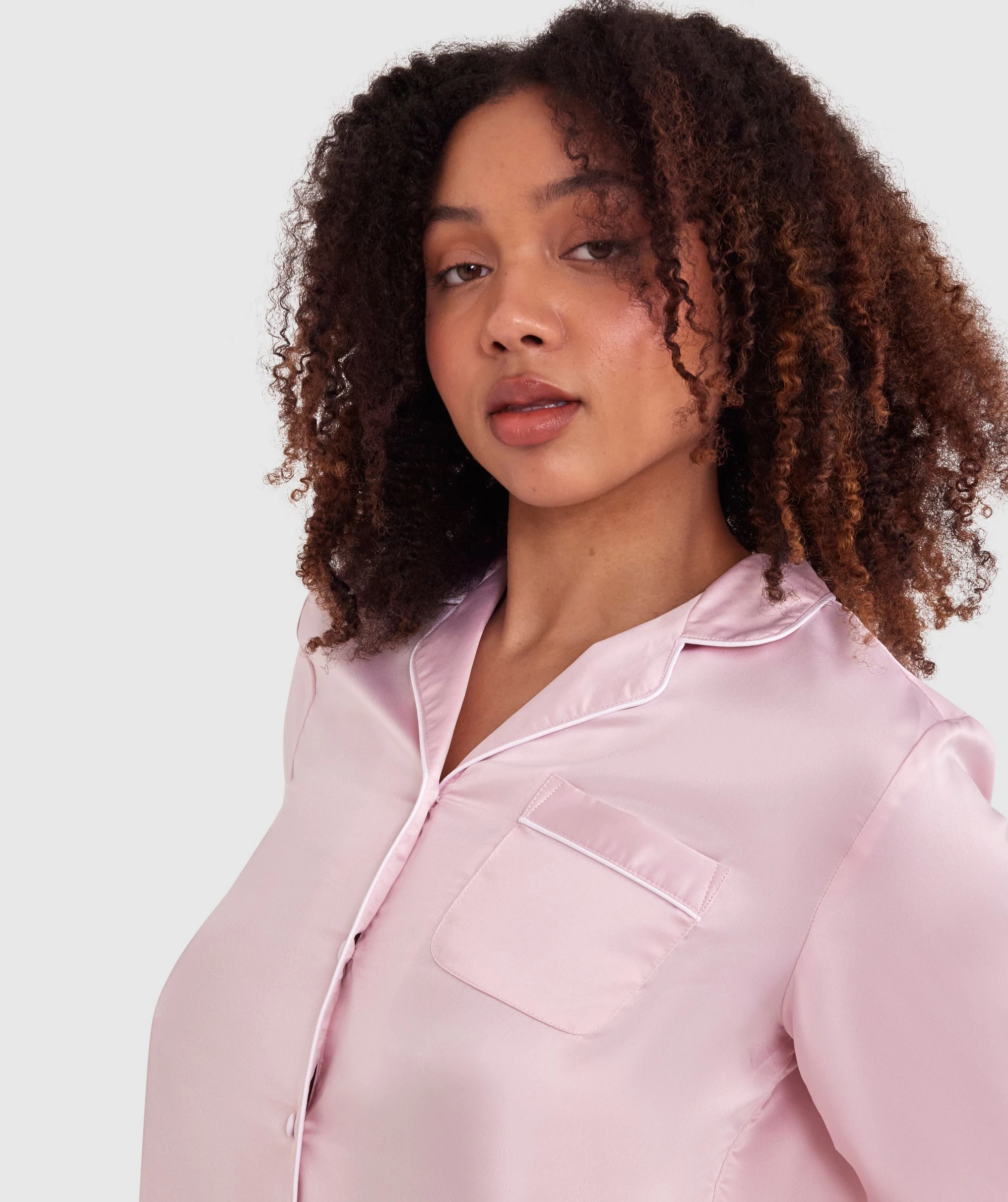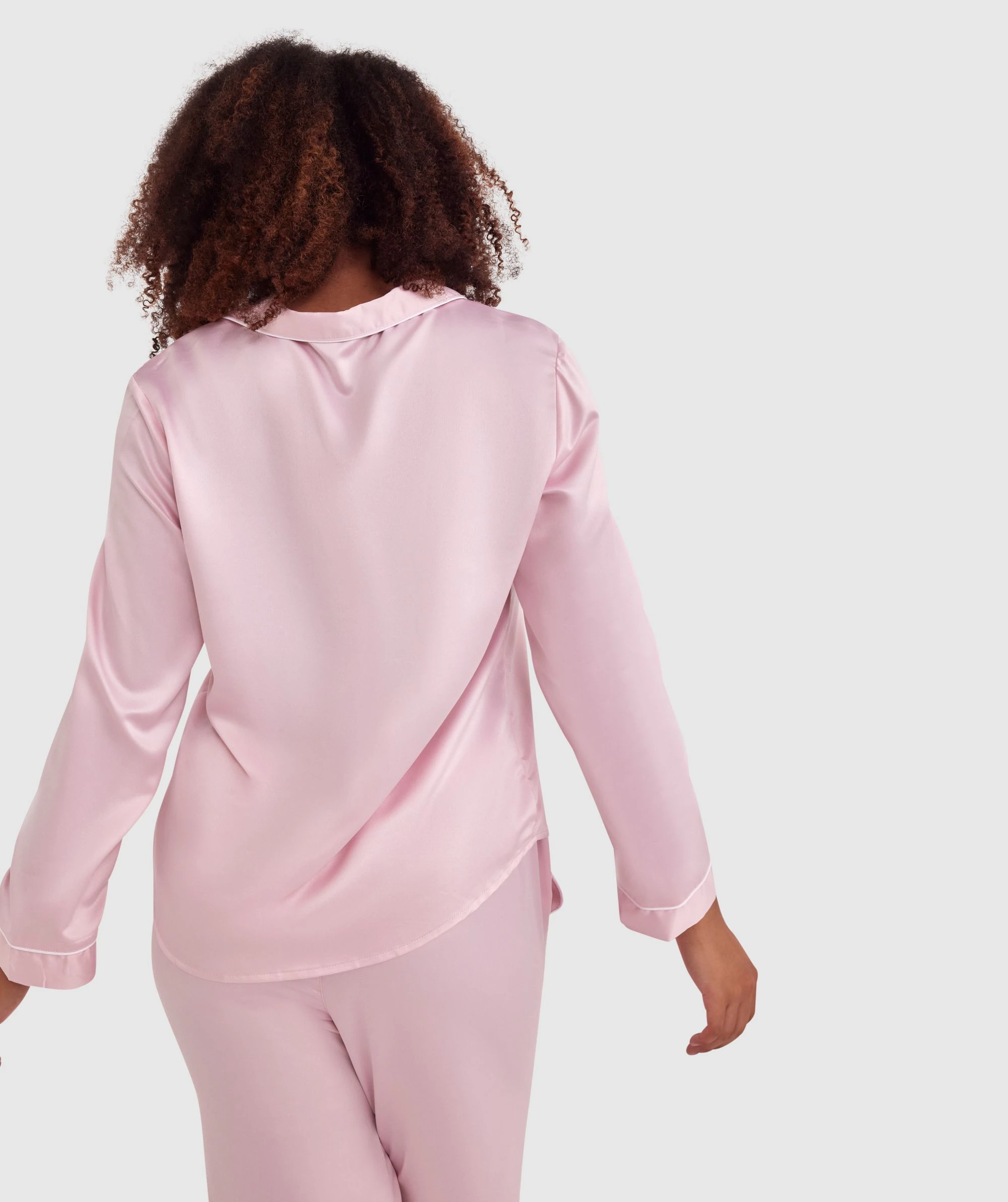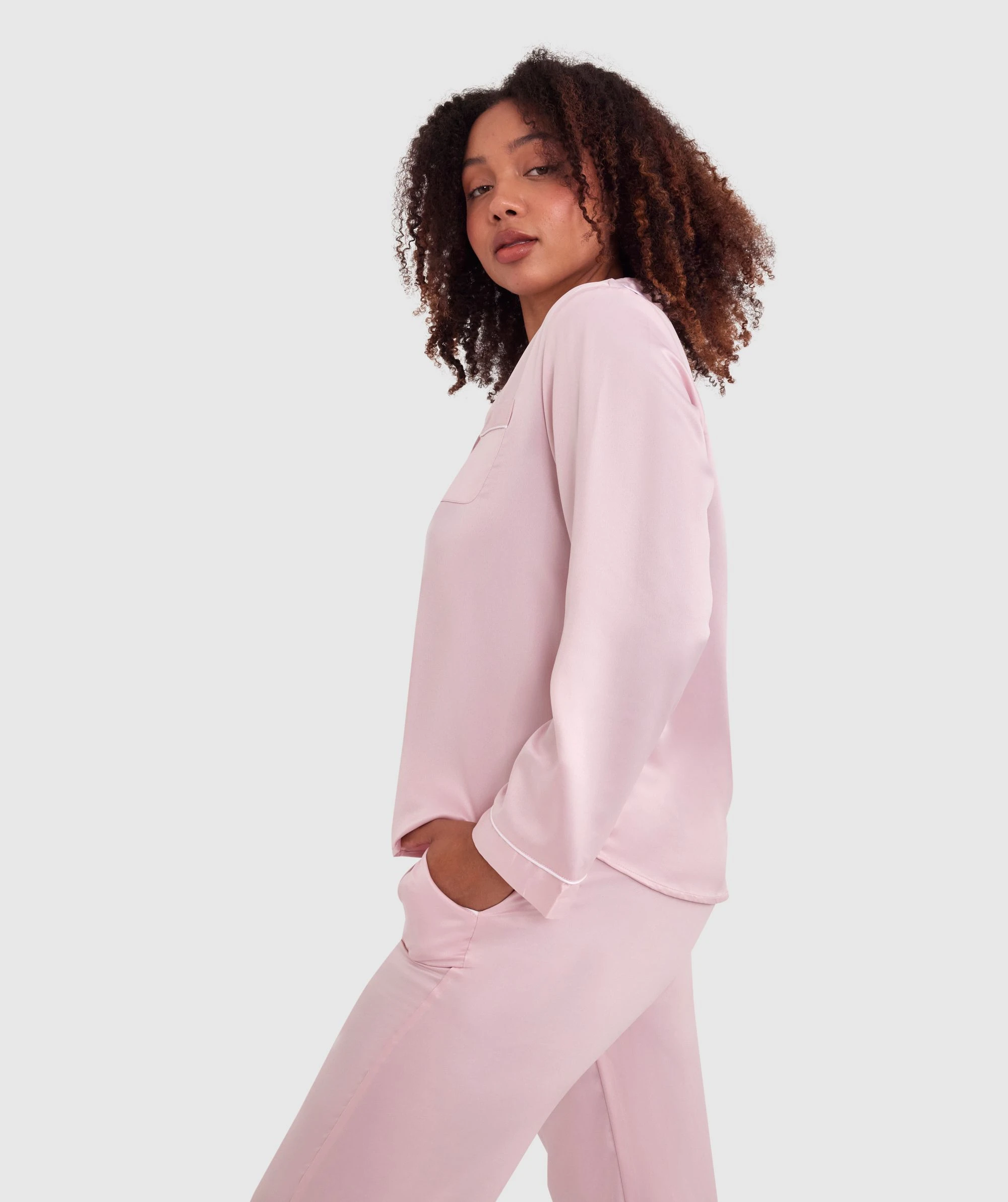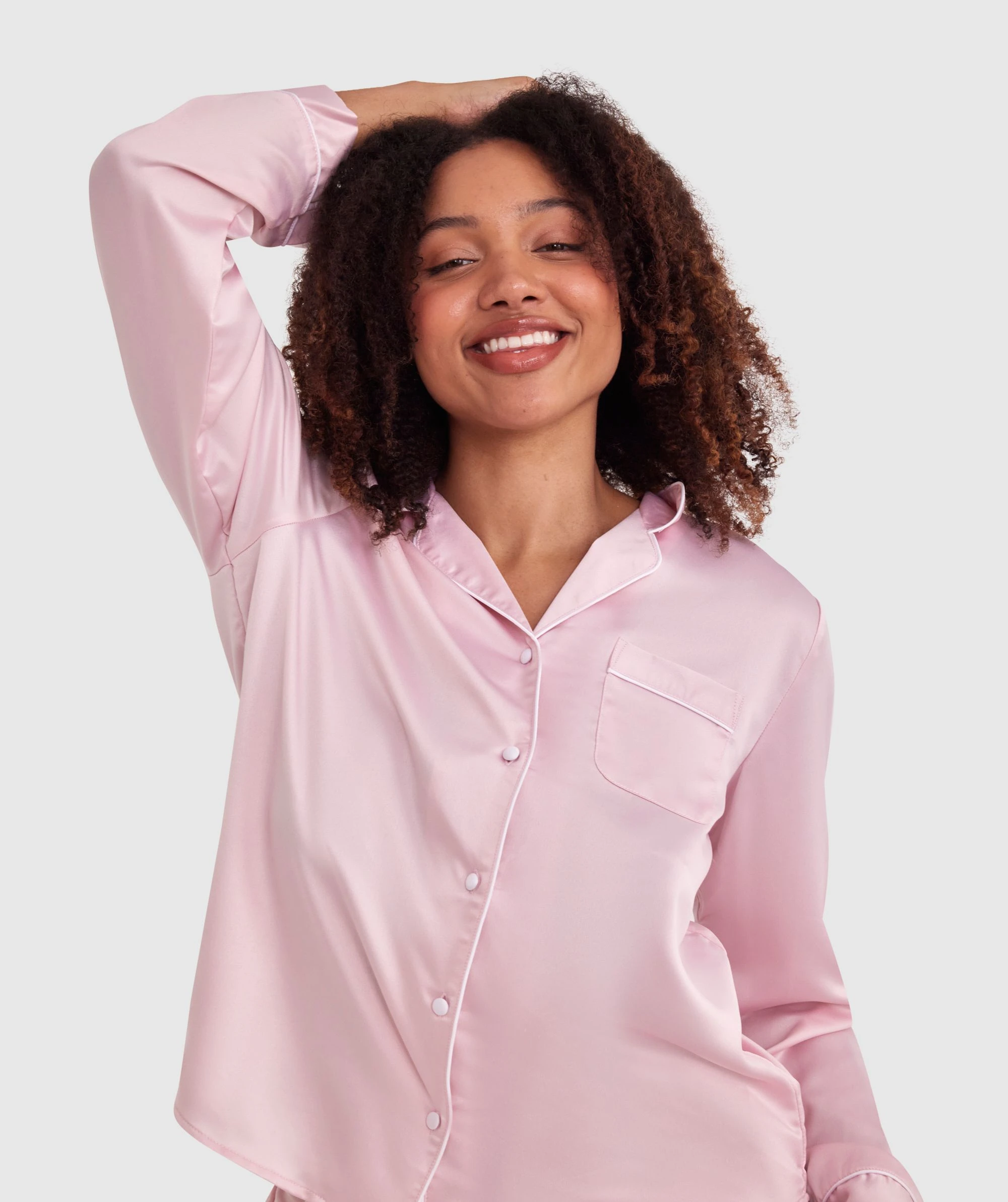 You can’t go wrong with our Liquid Satin Long Sleeve top in light pink! This gorgeous sleep shirt lives up to its name, offering shimmer and shine to captivate the senses. Its super-soft material reduces friction for optimal breathability & comfort.