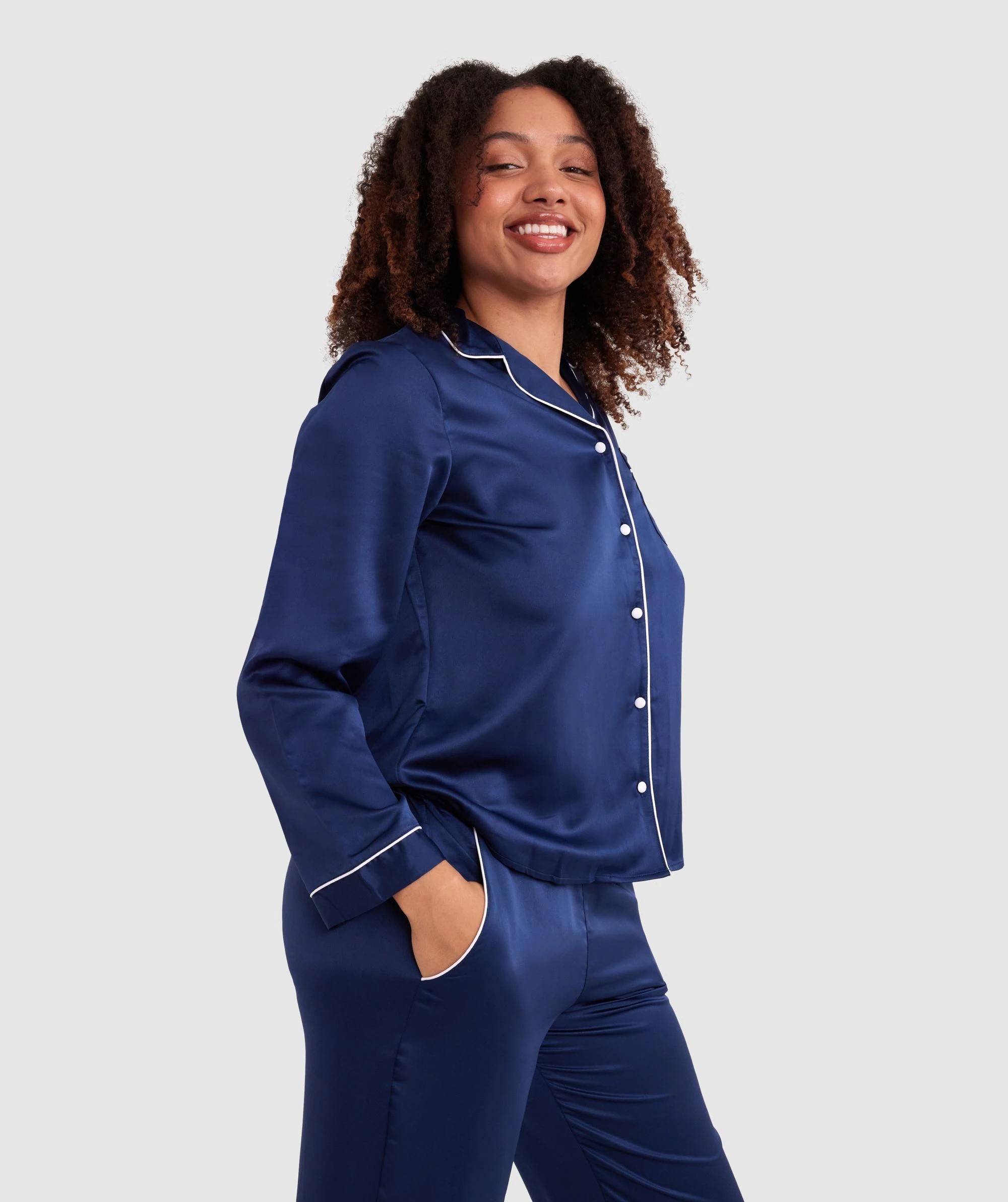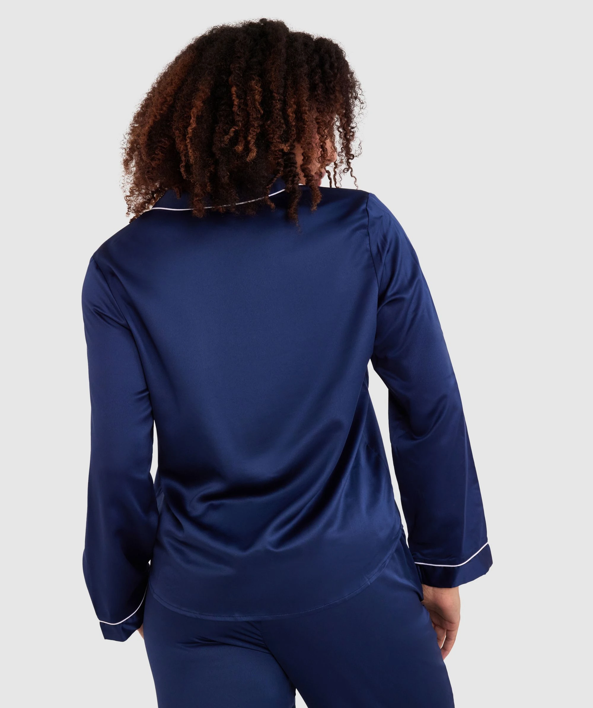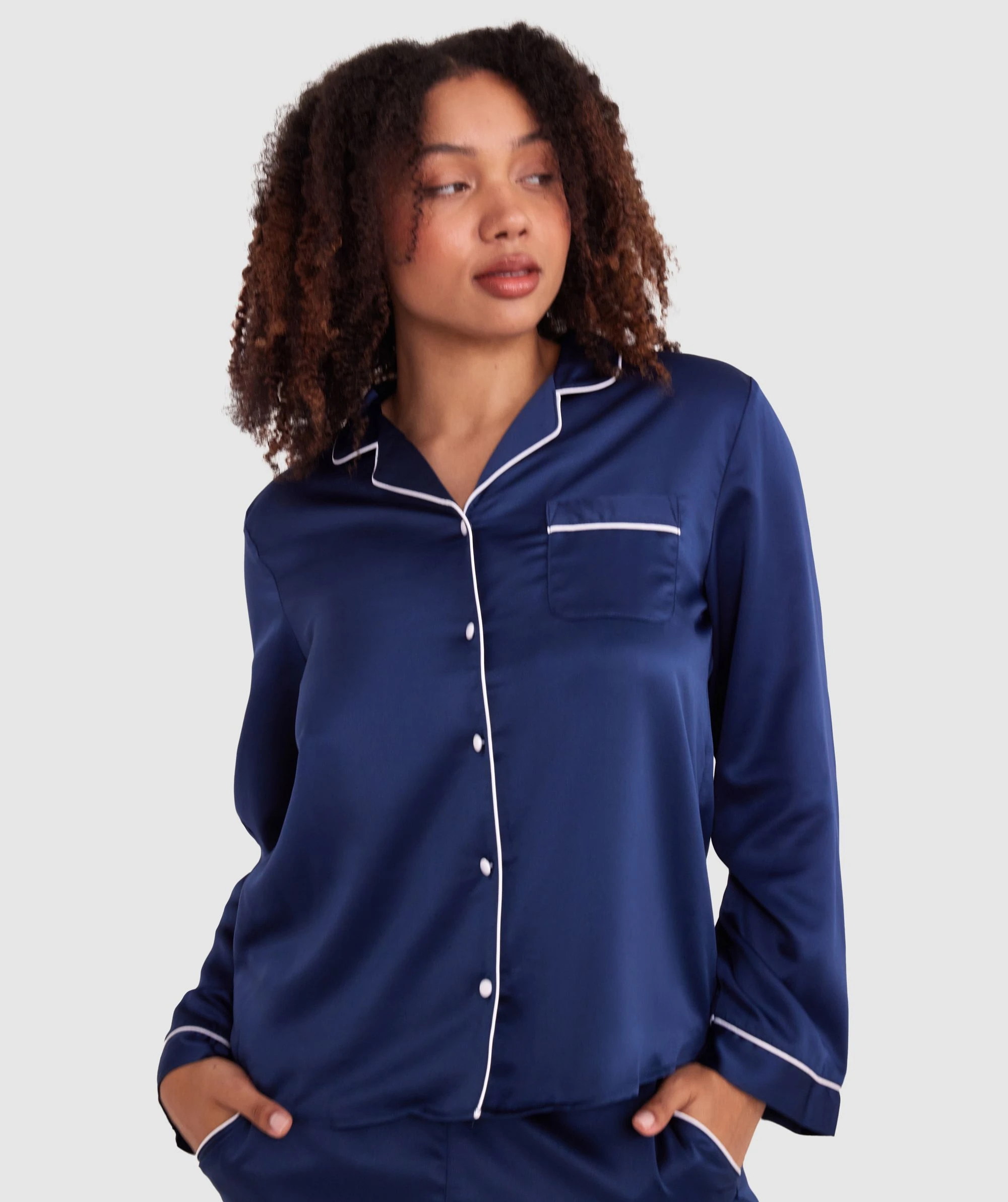 Say hello to luxurious sleepwear with our Liquid Satin Long Sleeve in navy. This trendy PJ top is made with lightweight silky fabric that shimmers and shines. It’s so deliciously soft and smooth against the skin, you may never want to take it off!