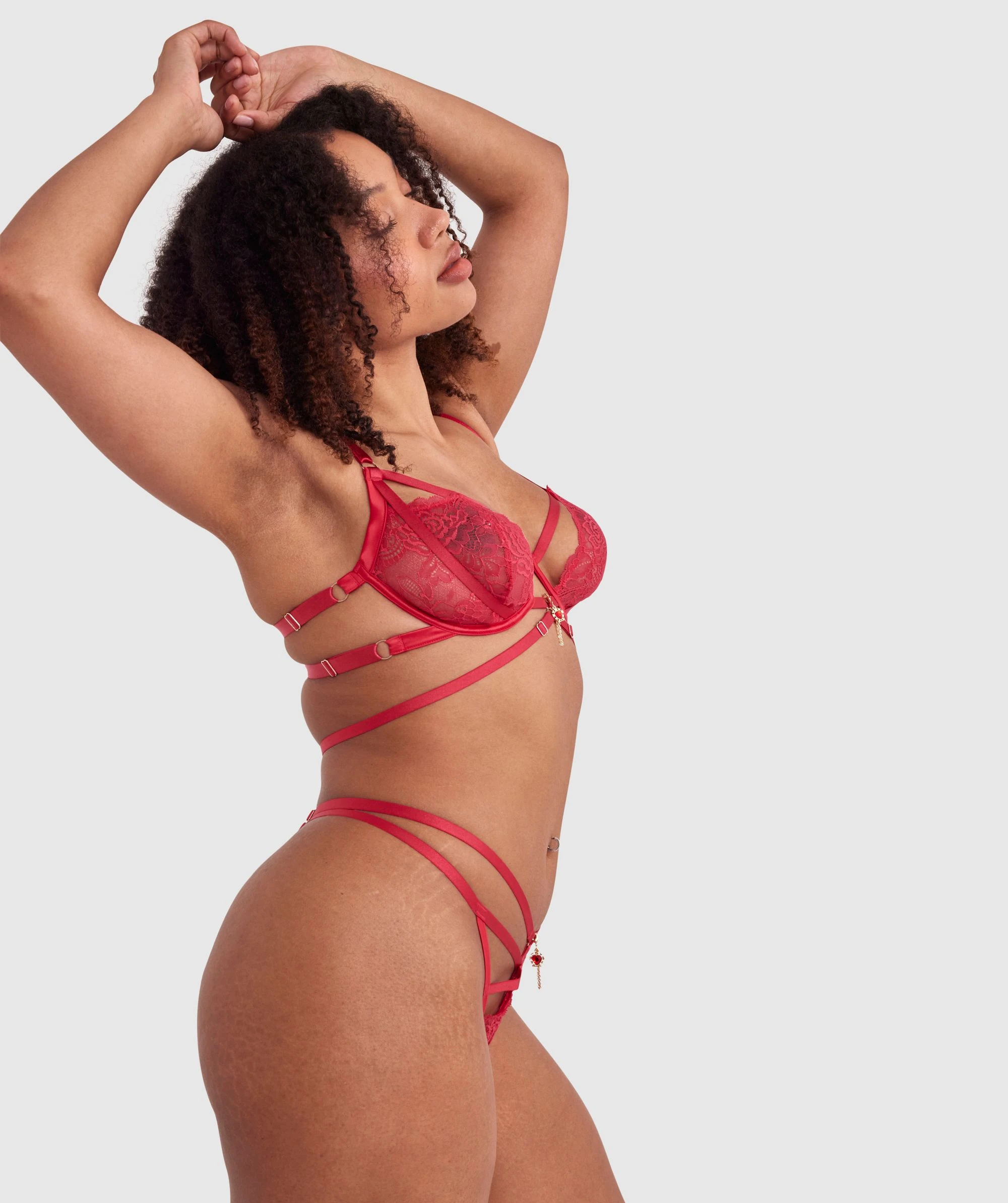 Adorned with lace and strappy binds, our Bleeding Hearts Soft Cup & Mini V Set is an exquisite blend of seduction and elegance. Golden metal accents add a touch of opulence to this red ensemble, making it a statement of passion and allure.