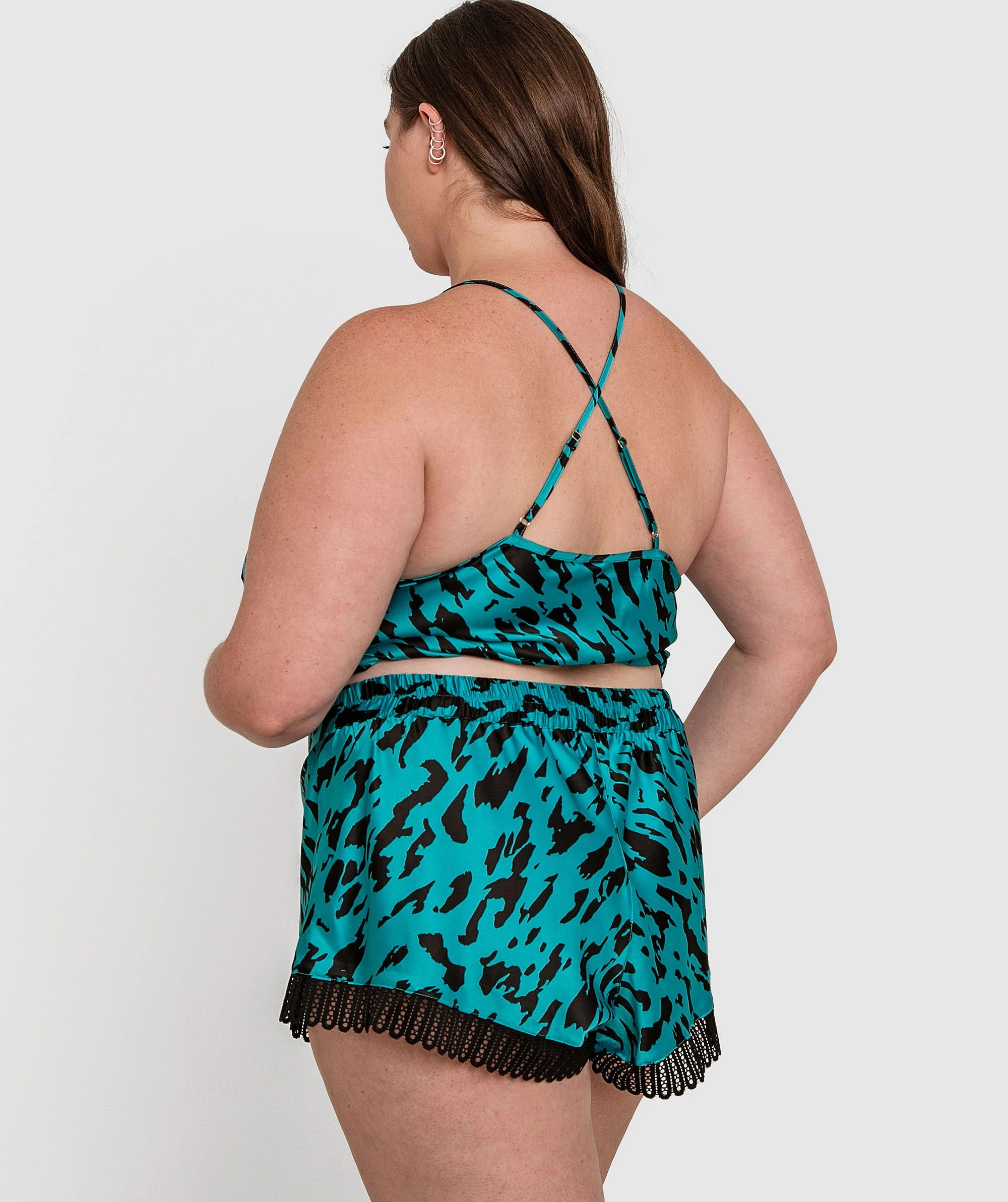 Revel in the softest feeling against your skin with our Zuri Shorts in an animal print pattern with contrasting blue and black hues. Features smooth and silky fabrication with geometric appliques on the hems. Feel like a diva as you sleep or lounge.